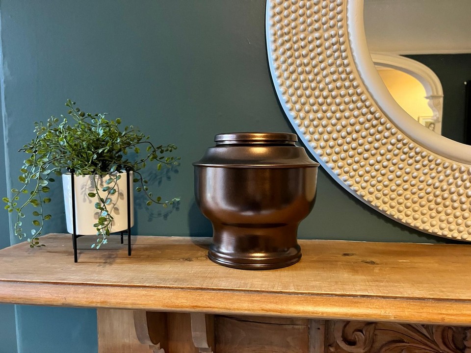 Lightweight and easy to carry, this urn is also ideal for families who may need to travel or transport cremated remains. Its rich bronze colour and simple yet graceful design make it a respectful and decorative memorial piece for the home.