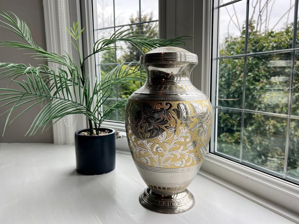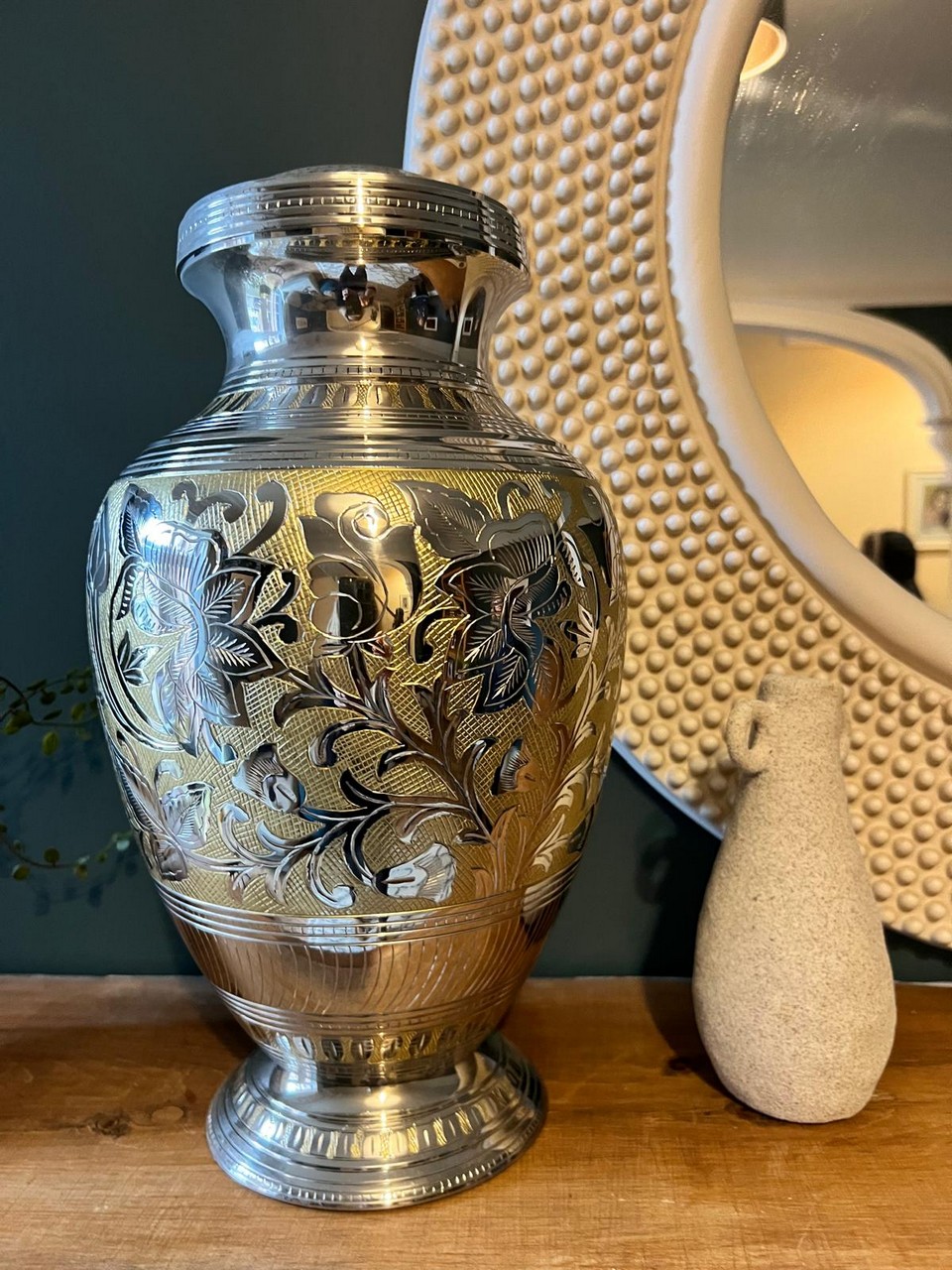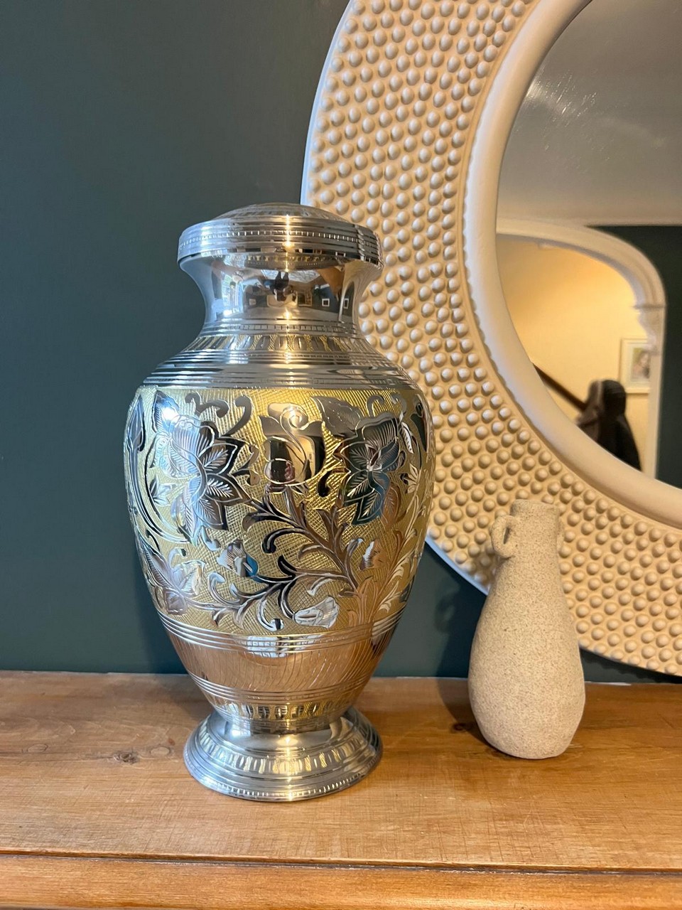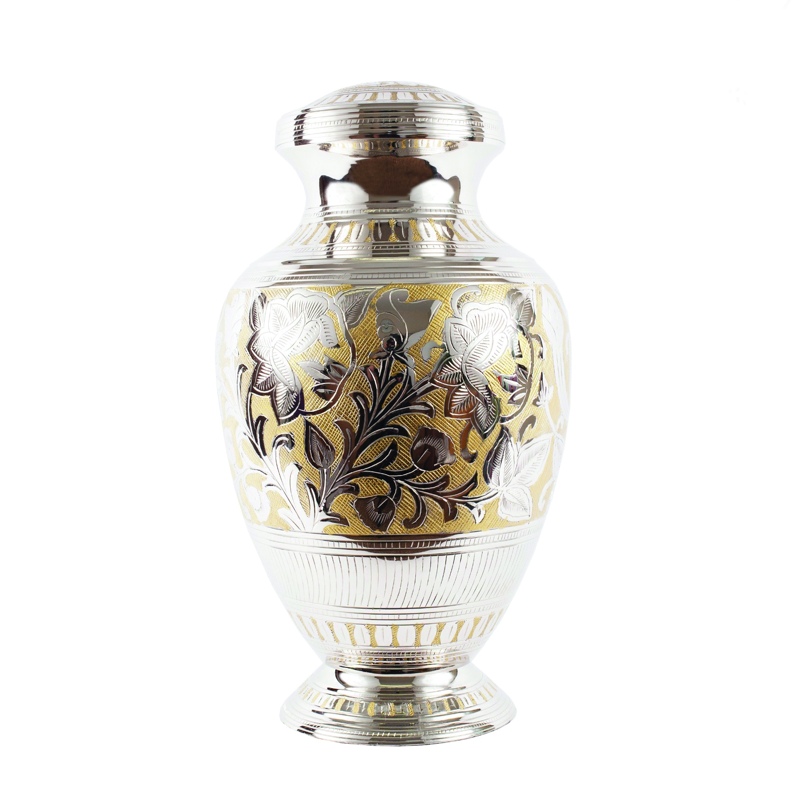 A beautiful brass Double Floral Engraved Urn in Silver and Gold which is designed to hold two full sets of cremated remains. This is a premium quality urn with a superb finish unlike anything seen in the UK before. The lid is engineered with a high quality threaded fastening, keeping the ashes secure inside.