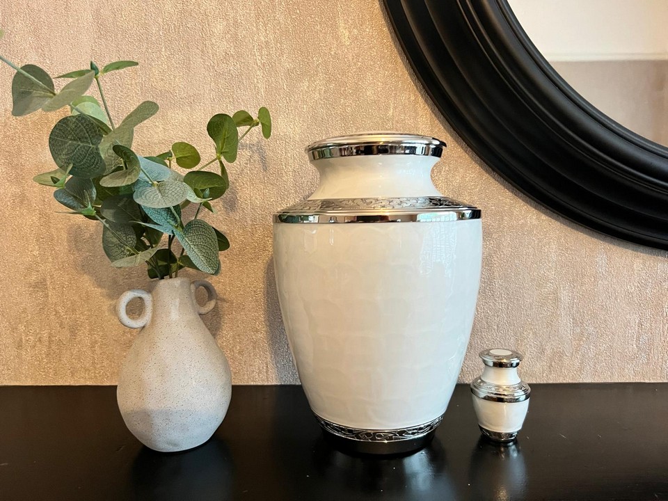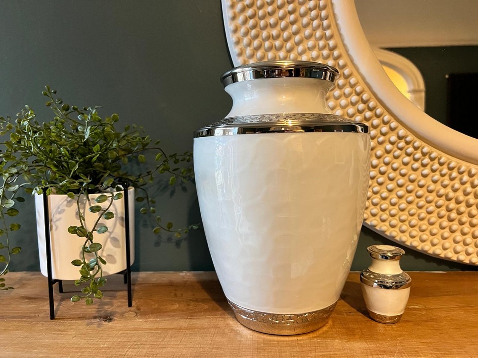 The elegant, beautiful silver urn – known as Silver Sympathy – is the perfect keepsake for a loved one that has passed away. Creatively handcrafted out of brass, this off-white silver urn is a unique and finely decorated with dedication, concentrating on the finer details to make this silver urn a remarkable design.
